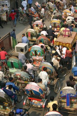 はいこんにちはー バングラディッシュは、リキシャと呼ばれる3輪自転車が 主な交通機関として市民の足となっています。 こんなやつです↓ ![]() それが一台一台綺麗に絵が書いてあったり ![]() 飾りつけも結構派手にしてあってとても綺麗です。 ![]() そんなリキシャが街中にあふれているとネット上に 書いてあったのですが、そんなこといっても あふれるほど多くはないだろーと思っていました。 インドにもリキシャはあったのですが台数としては まぁ普通かなって感じだったので、隣国のバングラでも まぁ似たもんだろなんてこと思ってバングラにきたのですが すぐに自分の考えが間違っていたことがわかりました! その模様がこれです↓ ![]() ものすごい大渋滞です。車道にバスとタクシーとバイクと 一緒にリキシャが大量発生していて、見渡す限り どこまでも大渋滞中です!すごすぎます!! ![]() この渋滞の中に突っ込んでいってみました! すごいです。かなりの混沌具合です! 歩行者やら馬車までが入り混じっています! その模様を動画で撮ってきたので再生ボタンを押してみてください! |