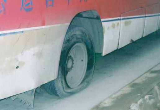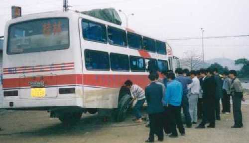 僕は今回の旅(中国編)では全く電車を利用しなかった。まず第一の理由が 高いからである。次の理由が・・・、ないのでとにかく電車が高いからバスで移動し てました。まずベトナムとの国境付近のピンシャン→南寧 南寧→桂林 桂林→ヤンシュオ ヤンシュオ→シンセン と移動は全てバスでした。 中国の寝台バスは車内に2段ベットが並んでいる感じで、日本の寝台バスと違い 本当に横になれるのでグーグー爆睡できるのです。さて問題なくヤンシュオまで 来たのですが、最後香港に向けてシンセンまでの寝台バスがもう大変でした。 午後5時頃ヤンシュオのバスターミナルを出発しました。車内は超満員です。 2時間ほど走った所で、バスは止まりました。トイレ休憩の様です。しかし何故か 誰も降ろしてくれず15分ぐらいその場で止まったままです。「???」謎です。 そして誰も降ろさず、乗せずにバスは再出発しました。そして5分後また止まりました。 どうやら本当にトイレ休憩のようです。僕も降りてトイレに行きました。ここでの 休憩時間は10分ぐらいだったでしょうか。そしてバスは再々出発しました。 10分後またバスは止まりました。どうやら今度は夕飯休憩のようです。「なら なんでさっき止まったんだよ。」と思いつつ全員強制的にバスから降ろされて鍵を 架けられてしまいバスに戻れません。そしてその休憩所は荒野の中にあり風がビュービュー 吹いていて物凄く寒いのです。そんな中みんな飯を食べない人も待たされています。 全く運転手は何を考えているかわかりません。物凄く寒くて耐えられなくなったので どこかからバスの中に入れないかと探していたら運転手席が開いていたのでそこから 入って中で寝てました。この食事休憩が一時間ありました。そしてバスは再再々出発です。 15分後バスはまた止まり「ブルルン、プスン」とエンジンを切ってしまったのです。 周囲にトイレや店らしきものは一切見当たらない荒野の真ん中で・・・。そして例の如く 誰を降ろす訳でもなく誰が乗って来る訳でもなく謎の停車時間40分が過ぎました。 最初はいらいらしていたのですが、途中から「これはおいしいネタになるかも知れないので どうにでもしてくれ。」と思いはじめました。そして再々再々出発です。一時間ぐらい 走ってまた停車。そして「ブルルン、プスン」とエンジンを切りました。しかし今度は 自動車修理工場みたいな所で後ろのタイヤの所をガンガンたたいたりして直しています。 この停車が30分ぐらいでした。そして再々再々再出発です。もうどうーにでもなれ。 見事?バスは直りバスは一路シンセンに向けて走り出しました。一時間後また止まりました。 今度は給油&トイレ休憩のようです。みんな一斉に降りようとするので効率が悪くて仕様が ありません。そして僕は一番後ろの席にいたのでやっと降りられると思ったら先に出てた奴等 が降りる人がまだいっぱい居るのにバスに乗り込んできてつかえて見動き取れません。しかし なんで外で全員降りるまで待つということができないのでしょうか?もう押し合い圧し合いで バス内は大混乱です。やっとのことでバスを降りることができ、トイレに向けて歩きだしたその時!! なんとバスはプシューとドアを閉めて走り出したのです!!「何で?今降りたの見ている筈なのに! 置いて行かれたらのたれ死にだ。」と思い必死にバスを追いかけました。そして追い付きバスのドアを ガンガンたたきました。振り返ると同じバスの乗客と思われる中国人5人ぐらいも必死に僕の後ろから バスを追っかけて走ってきてました。全くこのバスの運ちゃんは狂っているとしか思えません。 訳もわからず止まったり、イキなり走り出したり・・・。最悪です。 そしてバスは再々再々再々出発しました。今度は止まることなく長い時間走っています。そして僕は 眠りについたのです。朝方、ガタンガタン、ガタタタタンという衝撃で目が覚めました。 バスが異常にガタガタ揺れているのです。そしてついに道端に止まり、「全員降りろ」と言うのです。 そして訳もわからず降ろされて見たものは、昨日修理していた後輪が見事に ![]() パンクしているのです。そして僕らは近くの修理出来る所まで歩かされたのです。そして修理するのかと 思ったらまず最初の30分ぐらい誰も手を付けず、ずーっとパンクしたタイヤを見ているのです。 ただ見ているだけなのです。そしてようやく修理がはじまりました。すると一人だけが修理してその人 の周りをみんなでぞろぞろ動きながら囲んで見ているのです。別に珍しいものでもないし、見ていても 直るわけではないのですが、見ているのです。 ![]() そしてただのパンクが直るまで恐ろしいほどの時間が流れて行きました。そしてなんとかバスは直り 再々再々再々再出発しました。となんとも話題とストレスと人間が満載の寝台バスの旅でありました。 バスの旅はイギリスの時といいネパールの時といい何で、こうも