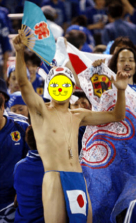 | ================================================= 最終回 やじん世界に配信 ================================================= ワールドカップで日本のサポーターの心意気を世界にアピールしたい! そんな熱き思いを胸に僕は青き衣を身にまとい 6月9日 日本VSロシア決戦の地、横浜へ乗り込みました。 しかいざ会場に入ってみると、僕に用意さていた席は1階席の一番後ろ…。 こんな席では日本代表に僕の熱き思いが届かない! ちゅうかそもそも全然サッカーが見えない!! そう思い僕は、席番を無視して 一番前の席へ 移動しました。 そこは警備の都合上、空けてあるスペースだったのですが(前2列)、 なぜか僕はそこへ入れました。 それはどうやら僕が身にまとっていた青き衣が原因のようです。 その青き衣に、警備員もひるみ、その空きスペースで応援し放題でした。 その青き衣をまとって他のサポーターと一緒になって応援していたのですが なぜか応援団長に間違えられ、応援をしきってくれとか ウェーブを起こしてくれとか色々注文されました。なぜか廻りからは 「大将」 と呼ばれています。はじめて会った人達なのに・・・ そして、周りからの視線が非常に熱くて突き刺さり、とても気になります。 それについては、神奈川県警もとても気になったようで “その青い衣脱いだら逮捕ね” と前半15分にイエローカード(警告)も頂きました・・・。 そんな僕の青き衣姿が日テレ、スカパーの電波に乗って全国へ放送され、 さらには ロイター通信 がその姿を激写して全世界へ配信したのでした…。 その結果、6月9日のトップニュースは トルシエでも稲本でもなく、 勝利を祝う日本人サポーター と名付けられた青きフンドシを〆た僕の姿だったのです…。 その写真がこれです↓ 間違いなくスタジアムで一番薄着だったでしょう。 そりゃ警察も警告だしますわ。 こうして日本のサポーターの姿は間違った形で 全世界へアピールされてしまったのでした…。 |