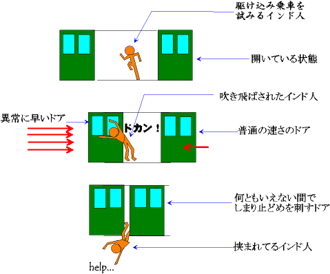 なんとインドのカルカッタには、地下鉄が走っています。道路ではいまだに、人力車が 走っていたりするのに。しかも、なんと自動改札なのである!コレには驚かされました。 しかも殺人的な渋滞とは無縁で、なんとも快適に目的地方面へ行けるのです。しかし、 そんな地下鉄でもインドらしいアバウトさを発見してしまいました。それは、自動ドア に関する話です。この地下鉄、自動ドアで開くのですが、僕の乗った車両のドアの一つは 開く時に、片方だけ開いて、片方は壊れていて手で開けるのです。こんなことには地元 カルカッタっ子も慣れたもんだという感じでした。僕もこんなことでは、別に驚きませ んでした。そして発車の時、向こうのほうから駆け込み乗車をして来るインド人がいました。 僕は、彼のペースから行けばギリギリセーフだろうと思いました。当の本人もそう 思っていたことでしょう。そして彼が列車に乗り込もうとしたまさにその時、ドアが 閉まりだしました。ここで、驚愕の事態が発生しました。 なんと、さっき手で開けた方のドアが恐ろしく早い速度で「ドカン!」と閉まり 彼は予想外のそのドアの速度に見事に敗れ去り、ふっ飛ばされていました。 そして痛がる彼をさらに追い打ちが!! 今度は、普通の速度で閉まってきたもう一方のドアにもぶつかり 両方から挟まれてしまったのでした。 なんとか抜け出ましたが、最初のドアの衝撃は見てる僕らでも 背筋が凍るほどだったので、彼はかなり痛がっていました。その後も4駅ぐらい 乗っていましたがそのドアは閉まる時だけ外れそうなぐらい早く閉まっていました。 ![]() カルカッタで地下鉄に乗る人は、予想外のことが起こるかもしれないので注意しましょう! |