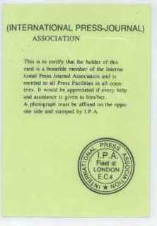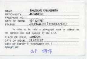 これまた、インチキ身分証明書の話です。上の学生証に続きまたもや ネタ作りのために作ってしまったのがジャーナリストの身分証明書です。 これは使い道がないのですが、なんとなく話のネタにはなります。他にも 国連の職員の身分証明書なんてのもありました。全くどこまで進化 するのでしょうか。その内FBIも作れる様になるのでしょうか? |
